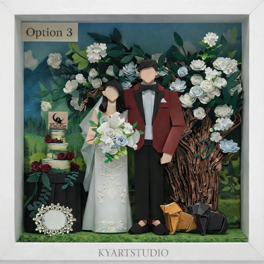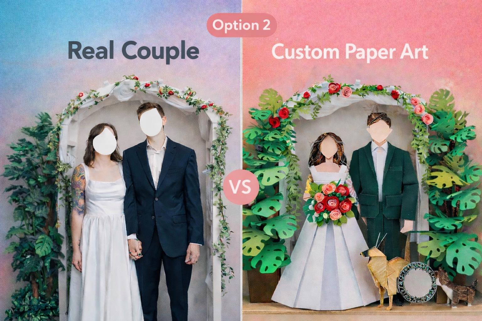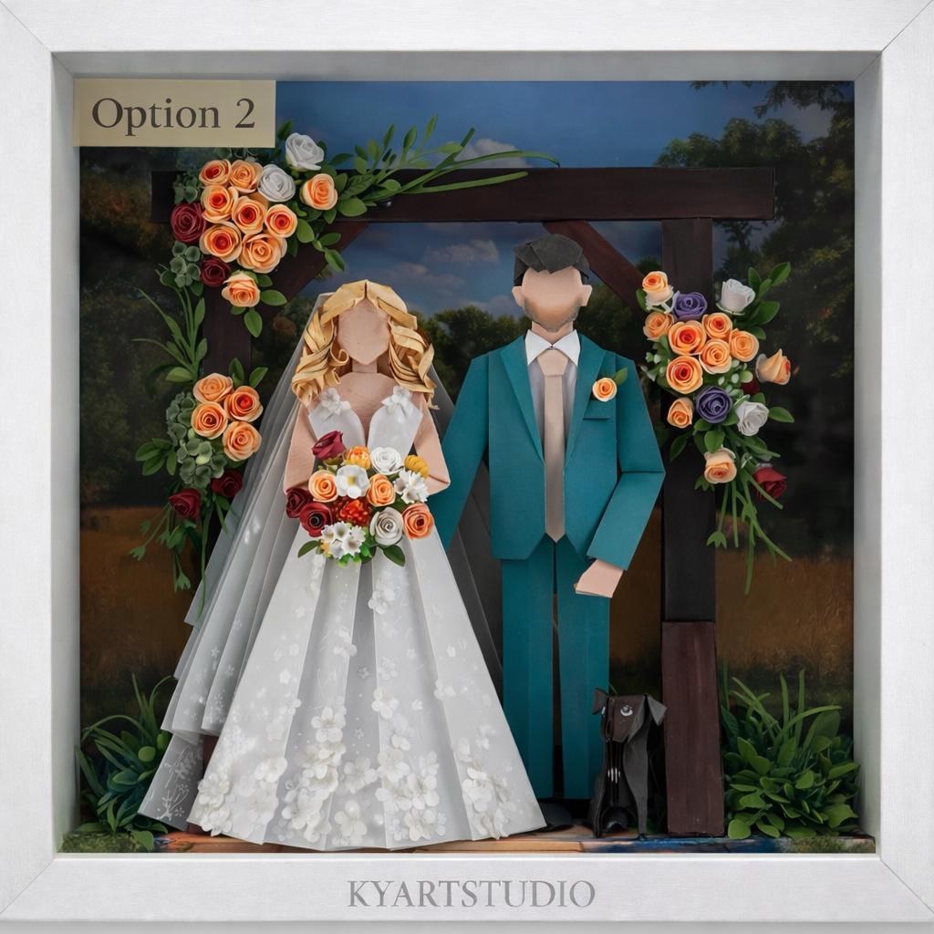 This paper artwork captures a wedding moment that quietly steps beyond the frame.
