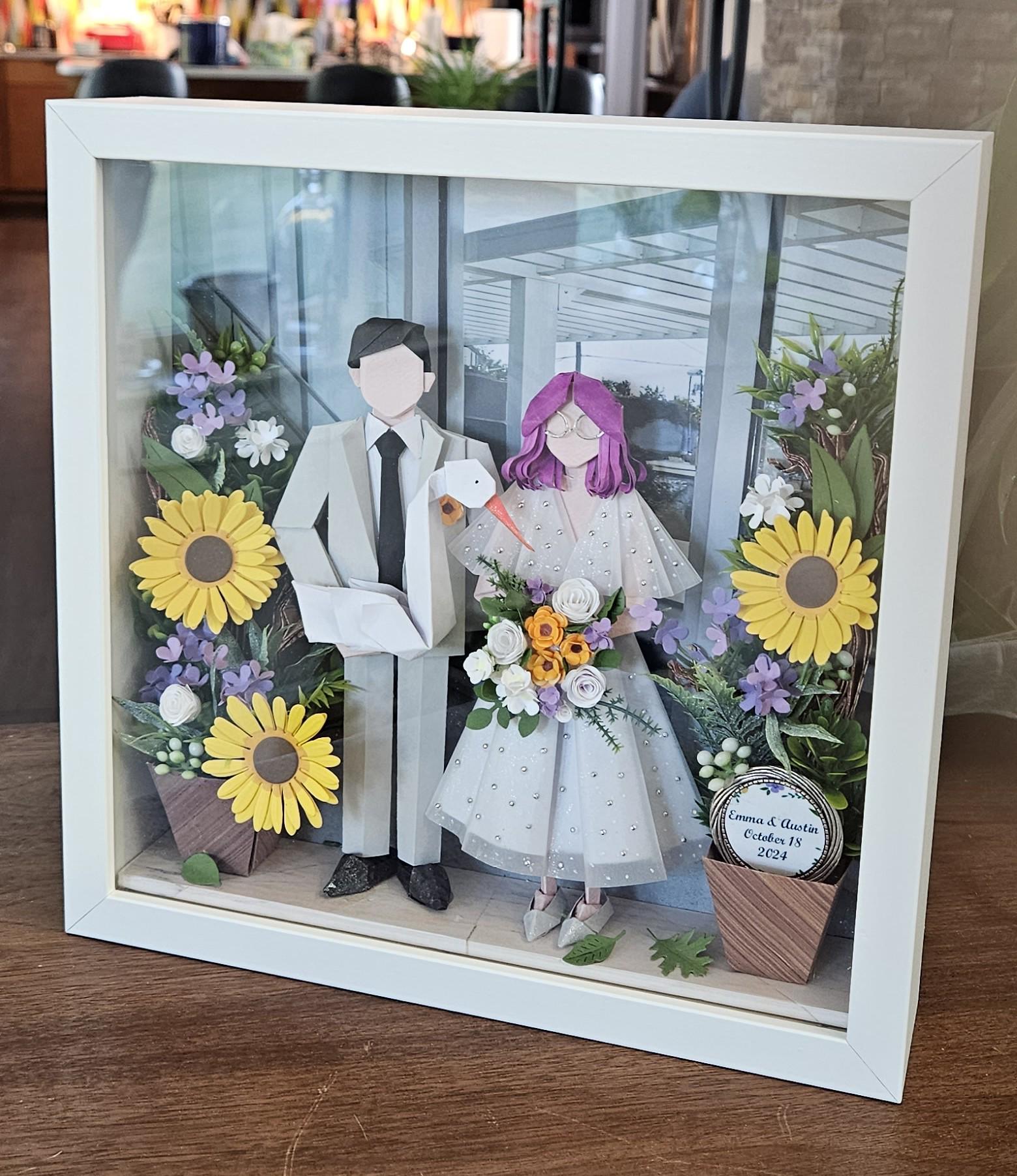 This origami art is based on your photos. I capture the scenes in a photo. It can be personalized : background, hair colour, dresses, suits, shoes & more details. And by using a deep shadow box frame, the actual work looks more solid figure than the photo. Also it is a style that does not depict facial details.